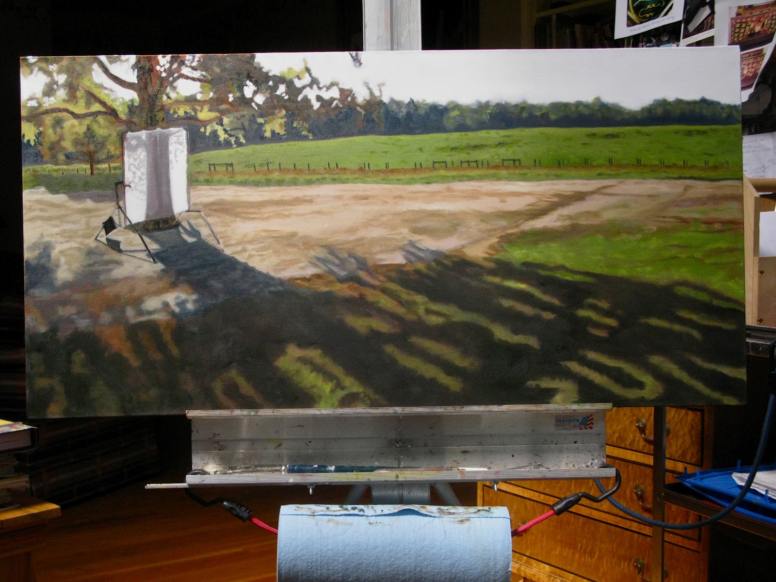 Why did this particular image grab me by the collar and holler 'paint me'? It has to do with the visual anomaly of this isolated bit of movie equipment in a rural scene. The shadow of the tree trunk reminds me of Indonesian shadow puppets. The peaceful, pastoral stillness of the background contrasts with the twisty reach of the shadows spreading out toward the viewer. It fits its zombie series origin.